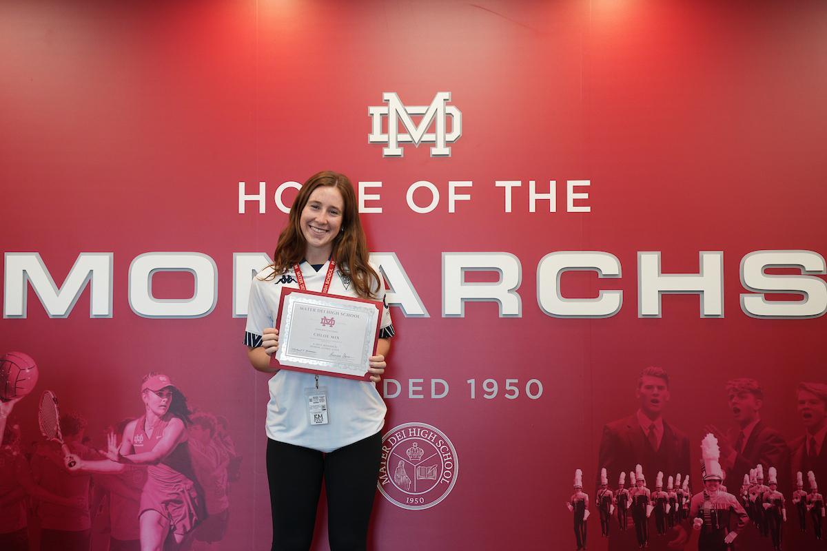Chloe Mix ’26 chose Mater Dei for its strong academics and the opportunity to compete in the Girls Soccer Program. Since arriving on campus, she has embraced the challenge of balancing athletics and academics while contributing to the Monarch community.