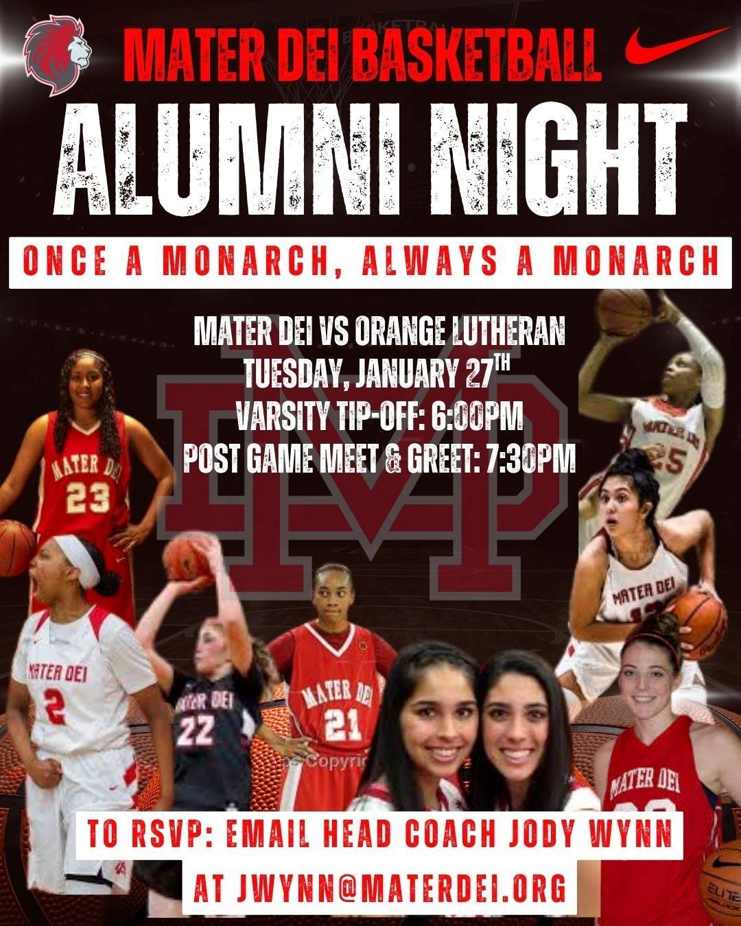 Calling all boys basketball alumni, coaches, and support staff, we hope you can join us on January 30th as the Monarchs take on JSerra at MDHS. Join us at 6 p.m. for pregame festivities and tipoff at 7 p.m. Stay after the game for light food and drinks and catch up with fellow Monarchs. Be sure to reach out to your teammates. GO Monarchs!